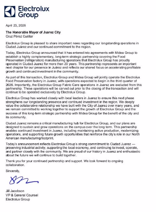 25 de abril de 2026 El presidente municipal, Cruz Pérez Cuéllar, dio a conocer una importante alianza estratégica entre Electrolux Group y Midea Group, la