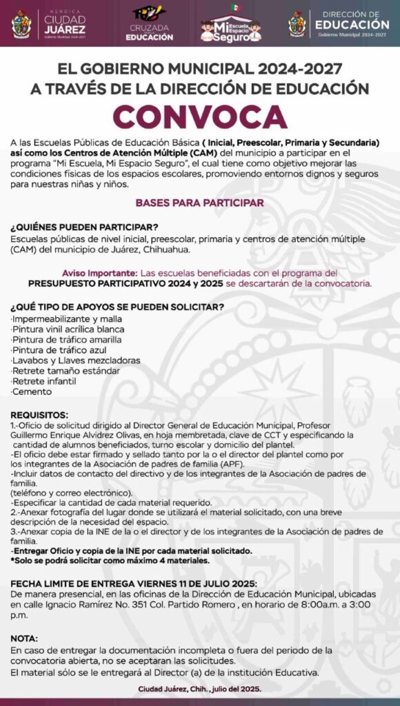El titular de Educación Municipal, Guillermo Enrique Alvídrez Olivas, informó que las escuelas podrán recibir impermeabilizante, malla, pintura vinílica, pintura para tráfico (amarilla y azul), lavabos, llaves mezcladoras, retretes infantiles o estándar, y cemento. La convocatoria excluye únicamente a los planteles ya beneficiados con el Presupuesto Participativo 2024-2025.