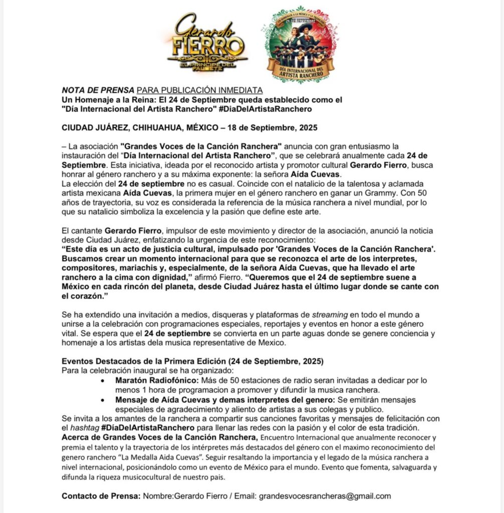 Ciudad Juárez, Chihuahua.— La asociación Grandes Voces de la Canción Ranchera anunció la instauración del 24 de septiembre como el Día Internacional del Artista Ranchero, fecha que se celebrará cada año en homenaje a intérpretes, compositores y mariachis que han llevado el género a escenarios de todo el mundo.