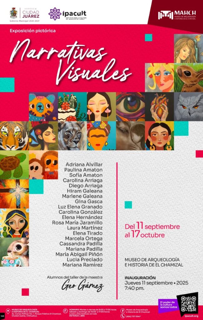 El Instituto para la Cultura del Municipio de Juárez (IPACULT) anunció la inauguración de la exposición pictórica “Narrativas Visuales”, que abrirá al público el próximo jueves 11 de septiembre a las 7:40 de la tarde en el Museo de Arqueología e Historia de El Chamizal (MAHCH).