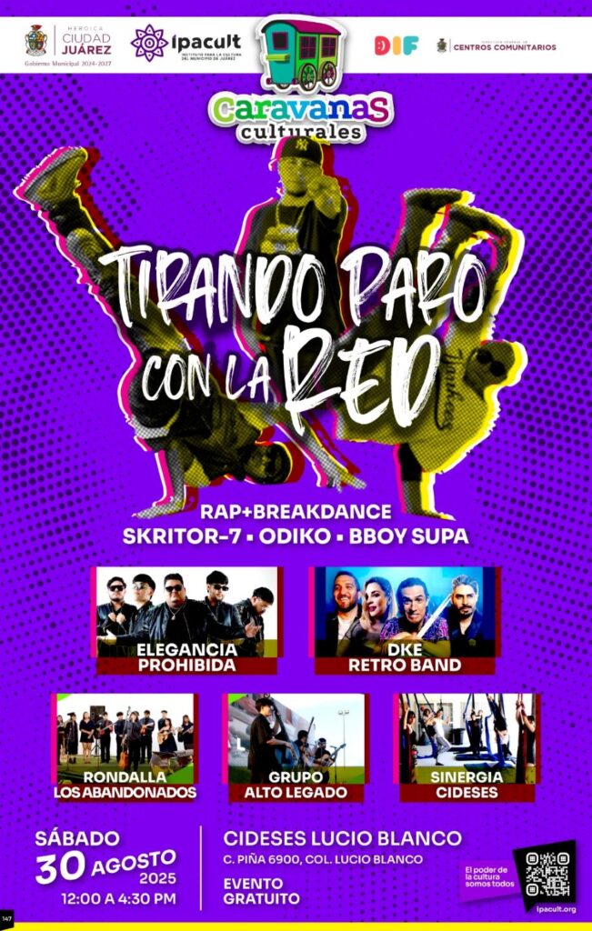 Ciudad Juárez, Chih.— El Instituto para la Cultura del Municipio de Juárez (IPACULT) acercará este sábado arte, música y servicios comunitarios a los jóvenes juarenses con la Caravana Cultural “Tirando Paro con la Red”, que se llevará a cabo en el Centro de Investigaciones Desarrollo de Proyectos Sociales, Educativos y de Salud A.C. (CIDESES) Lucio Blanco, a partir de las 12:00 del mediodía.
