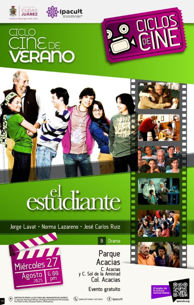 Ciudad Juárez.— Como parte del programa “Ciclos de Cine”, el Instituto para la Cultura del Municipio de Juárez (IPACULT) proyectará este miércoles 27 la película mexicana El Estudiante en el Parque Acacias, ubicado entre las calles Acacias y Sol de la Amistad, en la colonia Acacias.