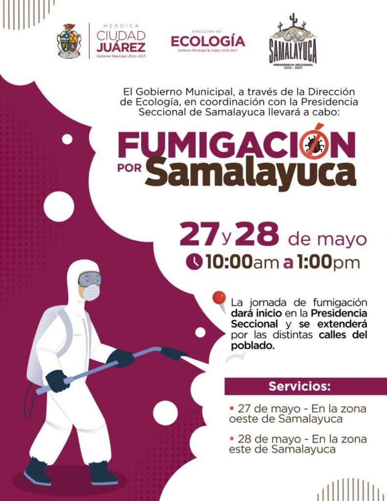 Con el objetivo de atender a la comunidad y prevenir plagas, el Gobierno Municipal, a través de la Dirección de Ecología y en coordinación con la Presidencia Seccional de Samalayuca, llevará a cabo la campaña “Fumigación por Samalayuca” los próximos martes 27 y miércoles 28 de mayo.